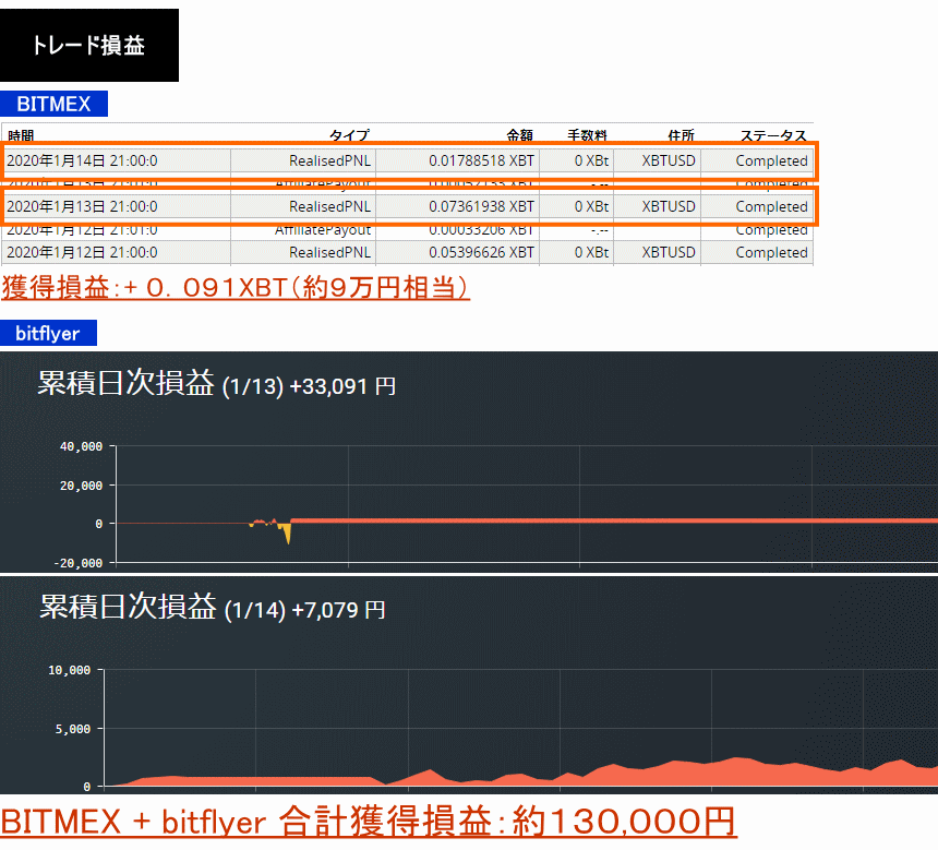 2020年1月13日〜14日:+0.091XBT+33,091円+7,079円=約130,000円
