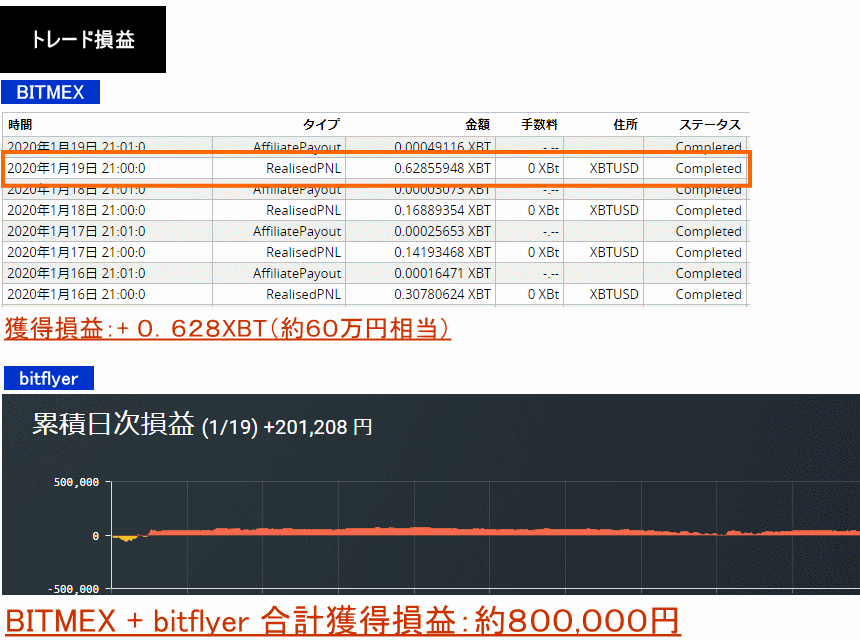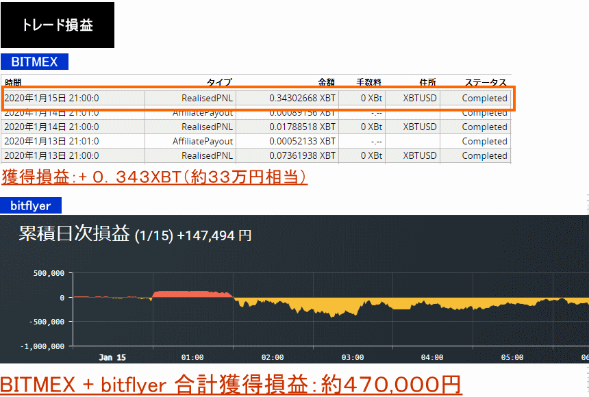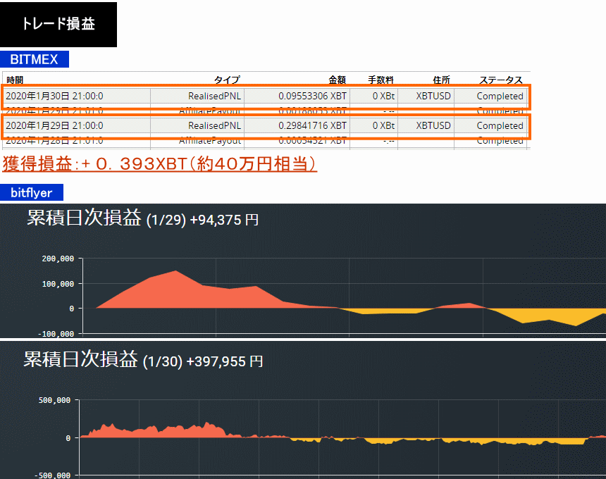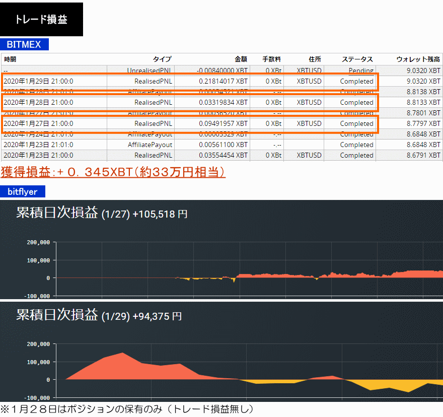 2020年1月29日〜30日:+0.345XBT+105,518円+94,375円=約440,000円
