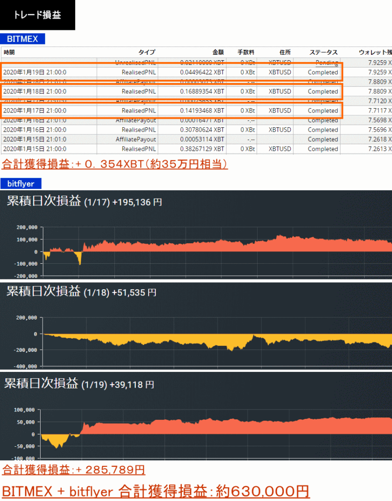 2020年1月17日〜19日:+0.354XBT+195,136円+51,535円+39,118円=約630,000円
