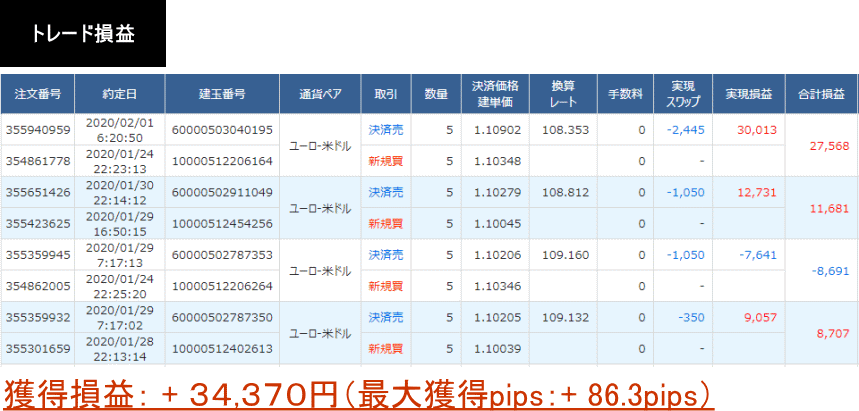 2020年1月24日〜29日:+34,370円(+86.3pips)