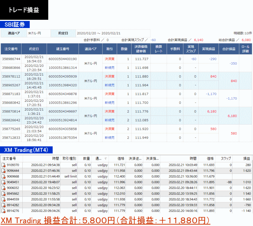 2020年2月21日:+6,080円+5,800円=+11,880円
