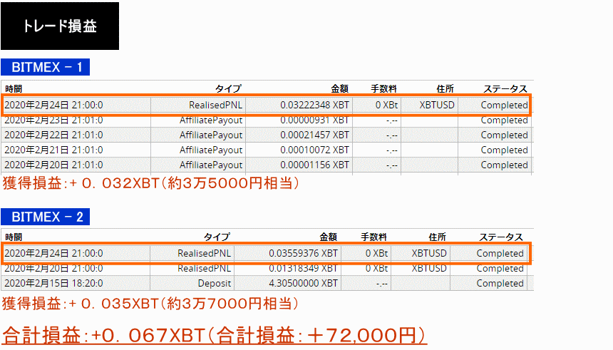 2020年2月24日:+0.032XBT+0.035XBT=0.067XBT(約72,000円)