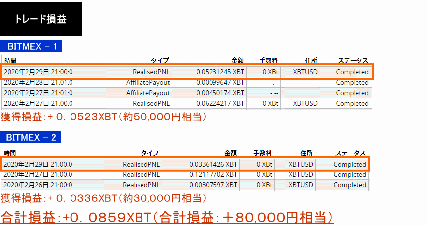 2020年2月29日:+0.0523XBT+0.0336XBT=0.0859XBT(約80,000円)