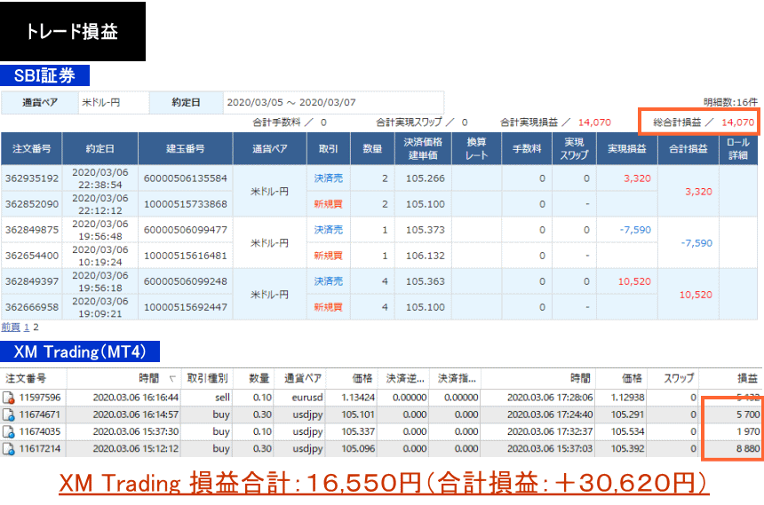 2020年3月6日:+14,070円+16,550円=+30,620円