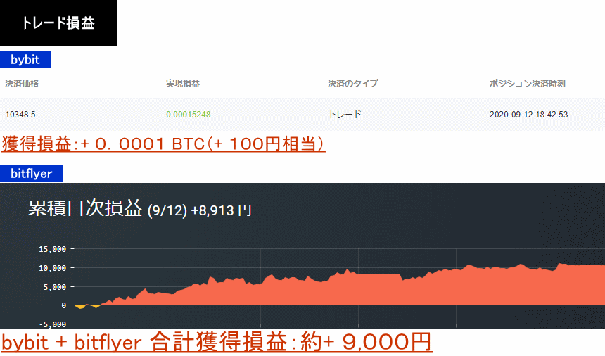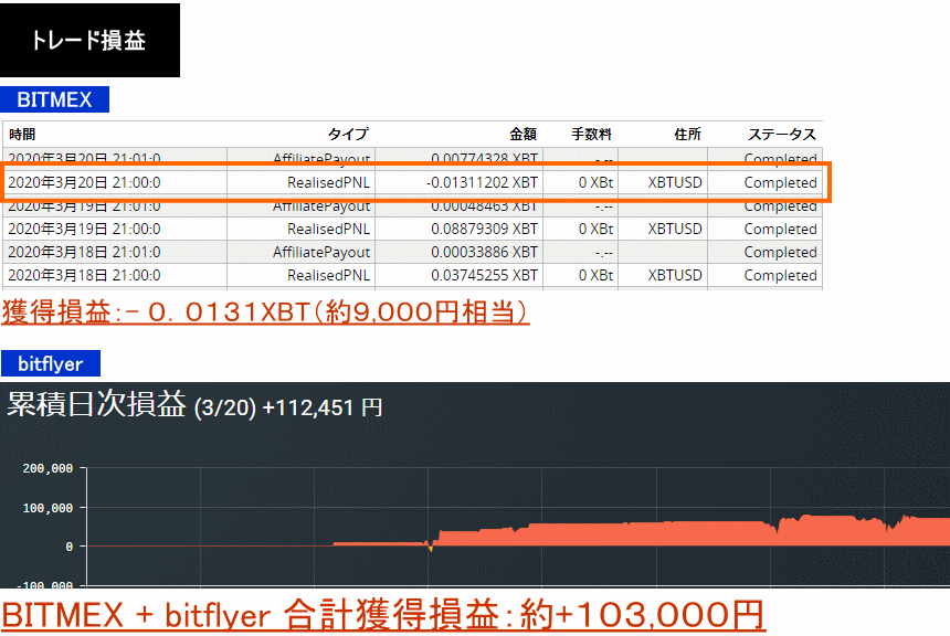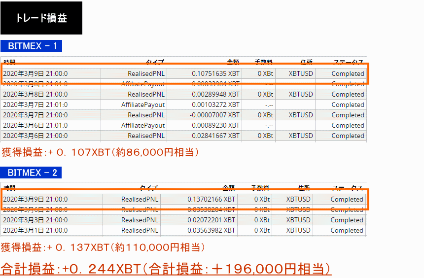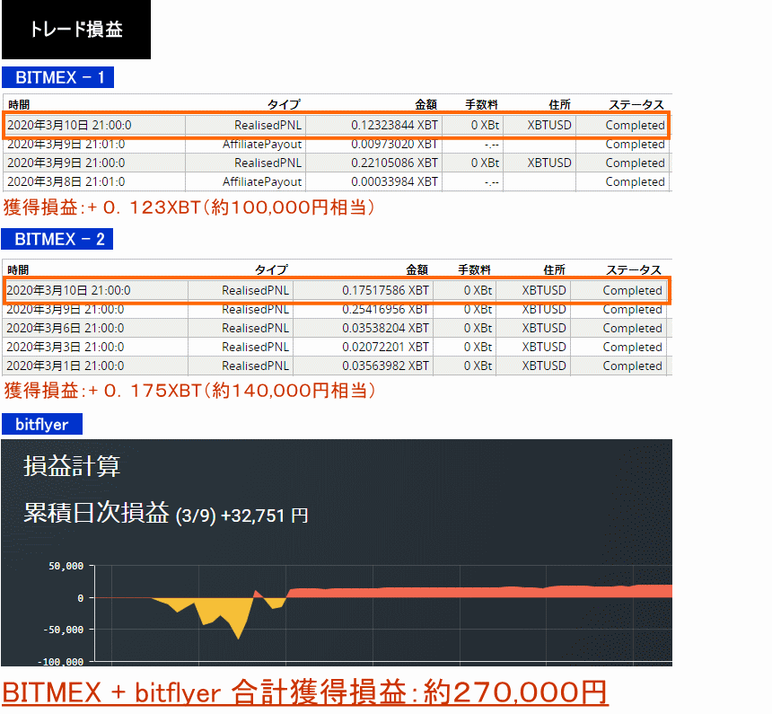 2020年3月9日〜10日:+0.123XBT+0.175XBT+32,751円=約270,000円