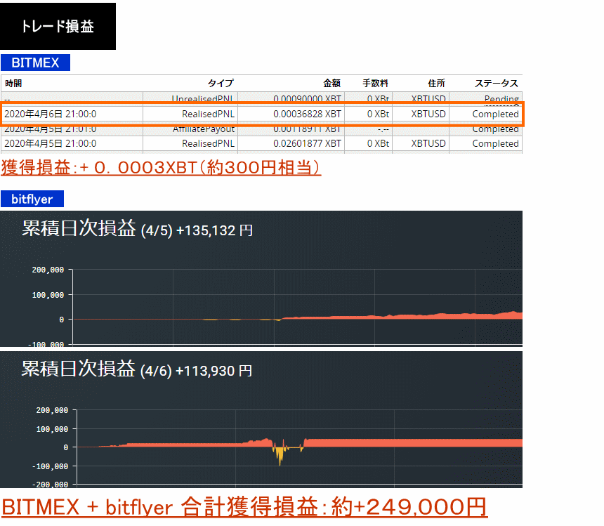 2020年4月5日〜6日:+0.0003XBT+135,132円+135,132円=約249,000円
