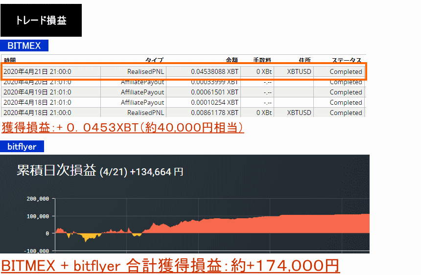 2020年4月21日:+0.0453XBT+134,664円=約174,000円