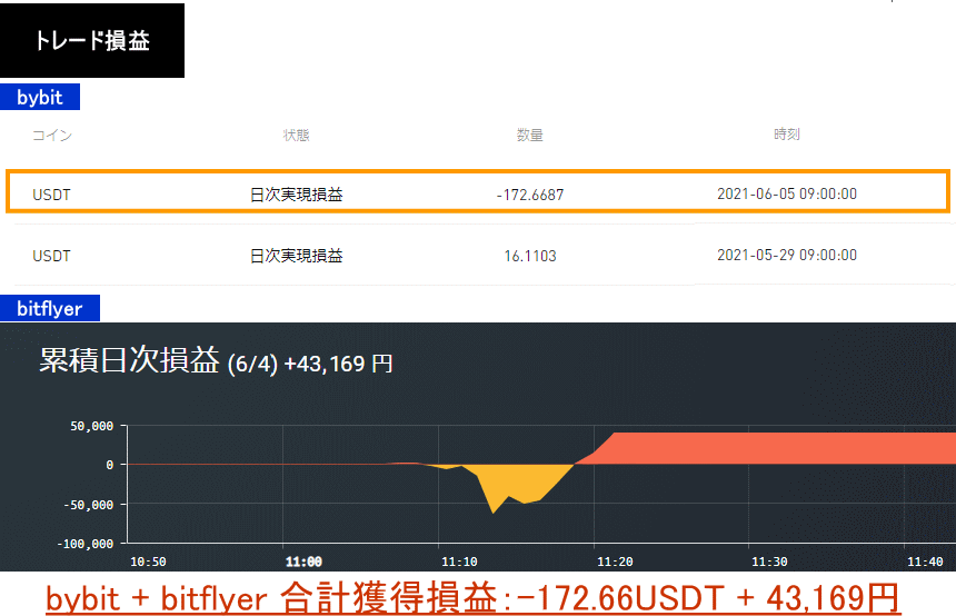 2021年6月4日:−172.66USDT+43,169円=+約25,000円