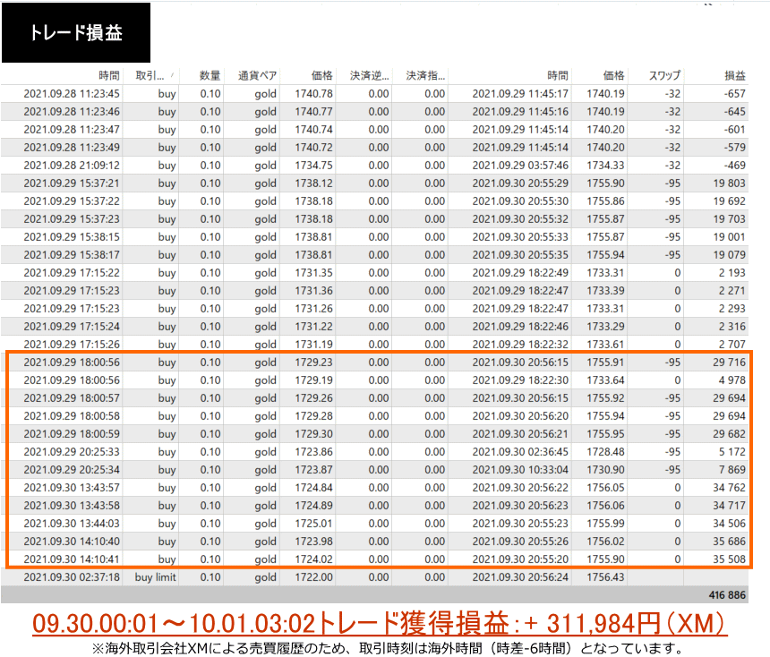 2021年9月30日〜10月1日:+311,984円(ゴールドトレード)