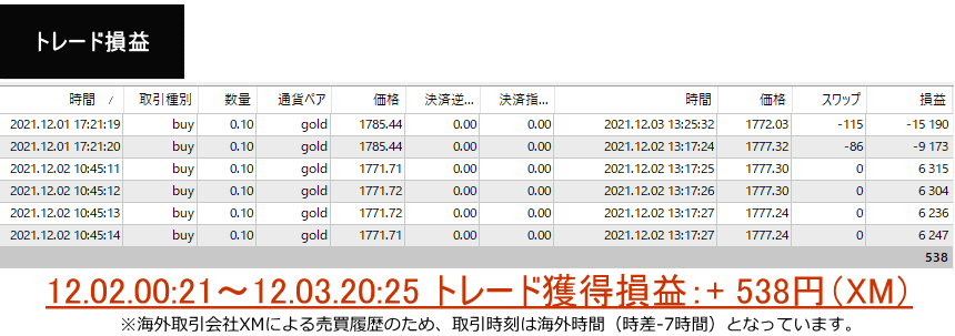 2021年12月2日〜3日:+538円(ゴールドトレード)